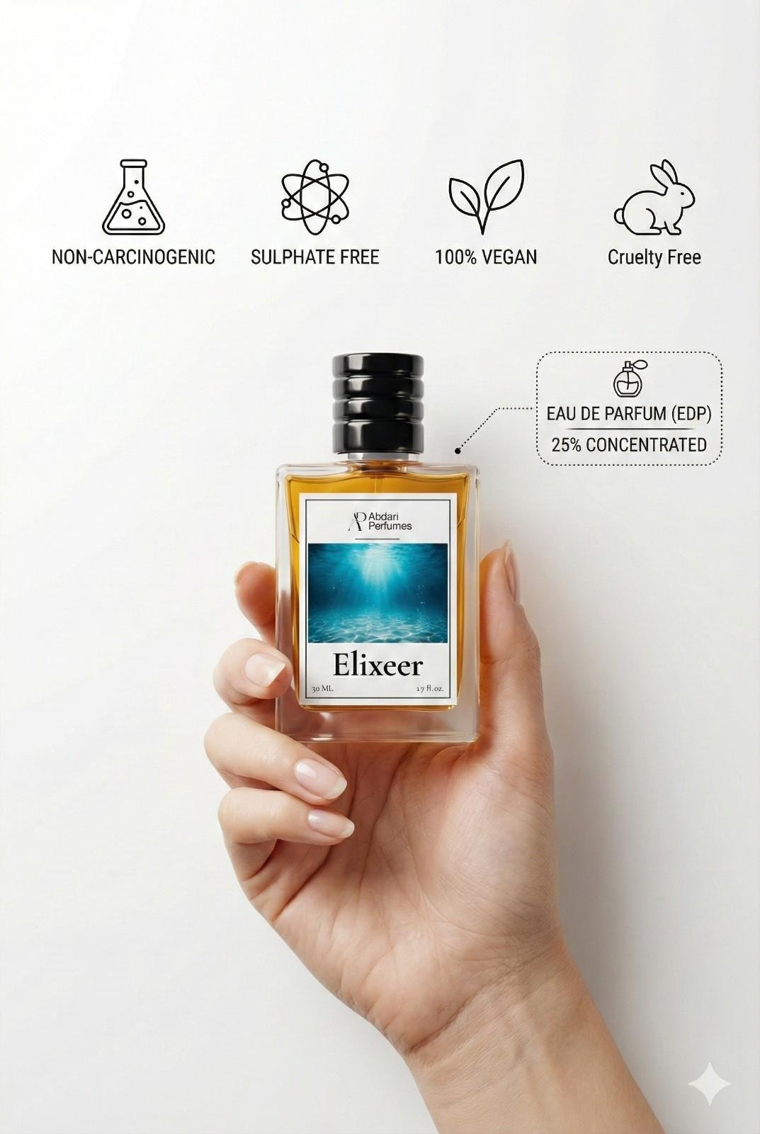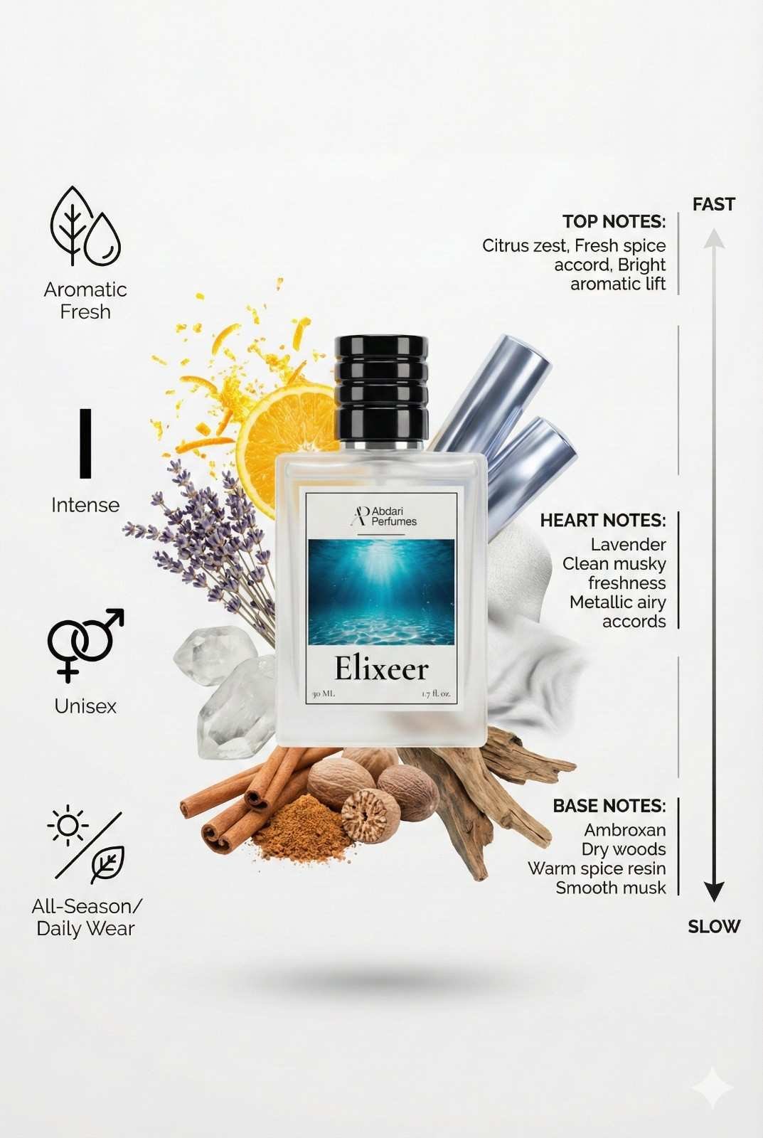 Elixeer by Abdari Perfumes is a fragrance crafted for those who move boldly, radiate confidence, and leave behind an unmistakable presence. Designed to feel clean, sharp, and powerfully modern, Elixeer captures the energy of a fresh aromatic breeze wrapped in subtle warmth.